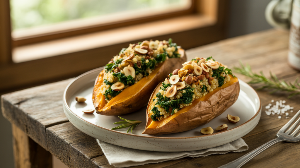 Batatas rellenas de quinoa con col rizada y avellanas: receta saludable y reconfortante