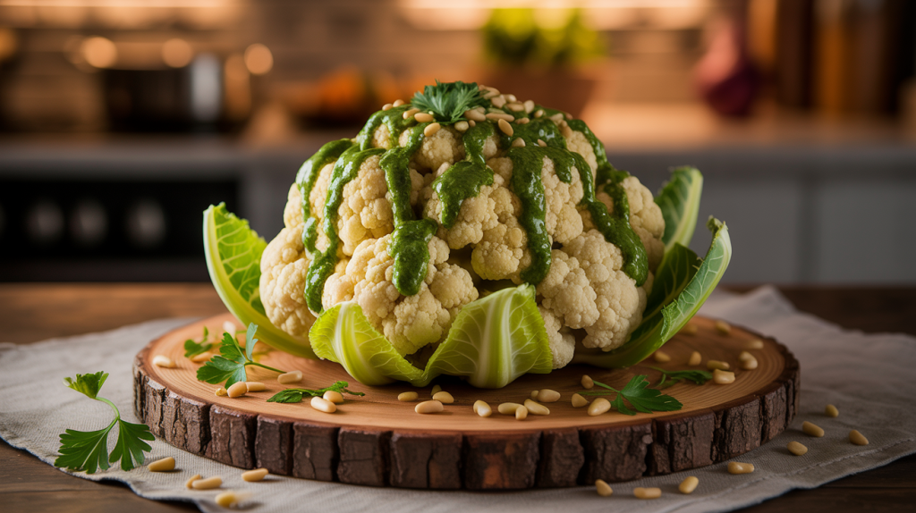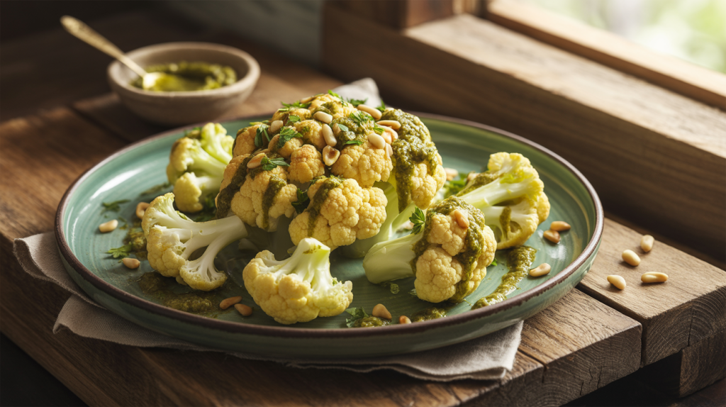 La coliflor nunca más será aburrida después de probarla así. El contraste entre las especias doradas en el horno y la frescura intensa del romesco verde hacen de este plato algo inolvidable. No importa si quieres una comida ligera entre semana o un plato para impresionar a tus invitados, esta receta siempre cumple.