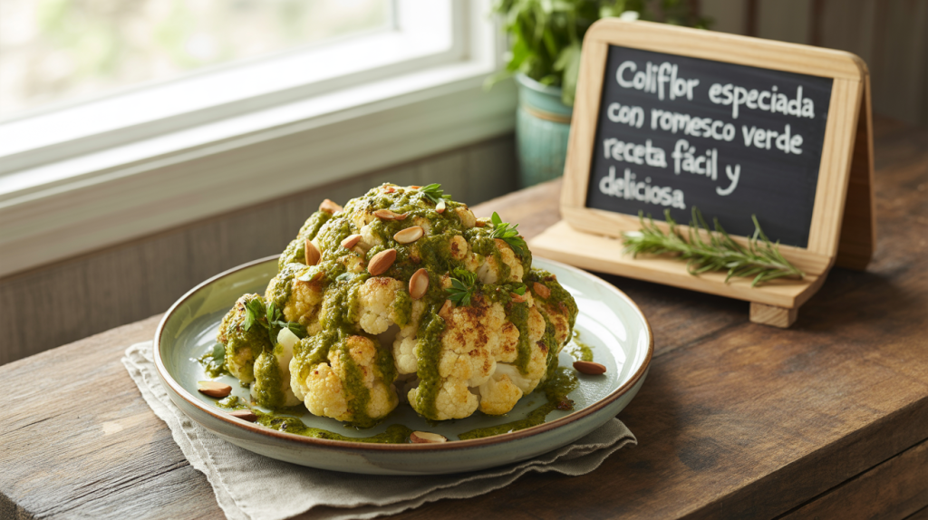 Hoy te voy a contar cómo preparar este plato desde cero, con trucos caseros, consejos prácticos y un paso a paso que cualquiera puede seguir. Además, hablaremos de las mejores especias, del secreto para conseguir una coliflor dorada y crujiente y, por supuesto, de esa maravillosa salsa romesco en su versión verde, que es la auténtica estrella.