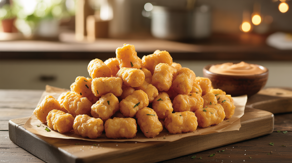 • Tater tots con queso: añade cheddar rallado en la mezcla para un interior más cremoso.